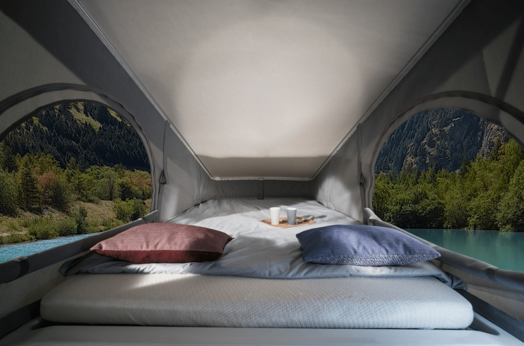 3) Deux couchages supplémentaires : La plupart des toits relevables intègrent un lit double, offrant deux couchages confortables en hauteur. Vous pouvez ainsi voyager à 3 ou 4 sans sacrifier l’espace de vie en bas. Dormir sous le toit, c’est aussi profiter d’une belle vue, d’une meilleure aération, et d’une expérience proche du bivouac sous les étoiles.